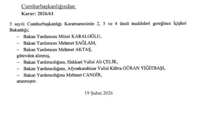İçişleri Bakanlığı Bakan Yardımcılığı görevlerine ise Afyonkarahisar Valisi Kübra Güran Yiğitbaşı, Hakkari Valisi Ali Çelik ve Mehmet Cangir atandı.. Bu atamalarla birlikte İçişleri Bakanlığı'nda daha önce görev yapan Münir Karaloğlu, Mehmet Sağlam ve Mehmet Aktaş görevden alındı..Adalet Bakanlığı'nda ise Ramazan Can, Hurşit Yıldırım, Mehmet Yılmaz ve Niyazi Acar görevden alınan isimler oldu..Kaynak: Haber Merkezi