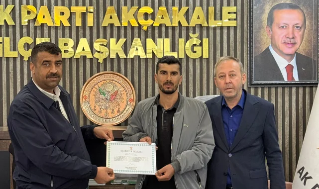 AK Parti Akçakale İlçe Başkanlığı, partiye gönül vererek üye olan Köseören Mahalle Başkanı Berces Özlü'ye bir teşekkür belgesi takdim etti. İlçe Başkanı İsa Sabuncu ve İlçe Başkan Yardımcısı İsmail Akkurt tarafından Özlü'ye verilen belge, birlik ve beraberlik vurgusuyla paylaşıldı.Parti yetkilileri, Köseören Mahalle Başkanı Berces Özlü'ye katılımından dolayı teşekkür ederek, Türkiye Yüzyılı hedeflerine emin adımlarla ilerlediklerini belirtti. Özlü'ye davaları yolunda hayırlı ve başarılı hizmetler dileğinde bulunuldu.