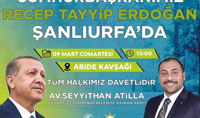 Atilla, yaptığı açıklamada, "Cumhurbaşkanımız Recep Tayyip Erdoğan, Şanlıurfa'mıza teşrif ediyor. Kendisini Abide Meydanı'nda düzenleyeceğimiz mitingte coşkuyla karşılamaya davet ediyorum" dedi.