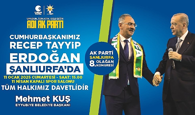 Eyyübiye Belediye Başkanı Mehmet Kuş, yarın (11 Ocak 2025 Cumartesi) Cumhurbaşkanı Recep Tayyip Erdoğan’ın katılımıyla gerçekleştirilecek olan AK Parti il kongresine tüm Şanlıurfalıları davet etti.Başkan Kuş, AK Parti Genel Başkanı ve Cumhurbaşkanı Recep Tayyip Erdoğan’ın, yarın saat 15.00’te 11 Nisan Spor Salonu’nda düzenlenecek olan AK Parti Şanlıurfa 8. Olağan Kongresi’ne katılmak üzere Şanlıurfa’da olacağını hatırlatarak, tüm Şanlıurfalıları kongreye davet etti.