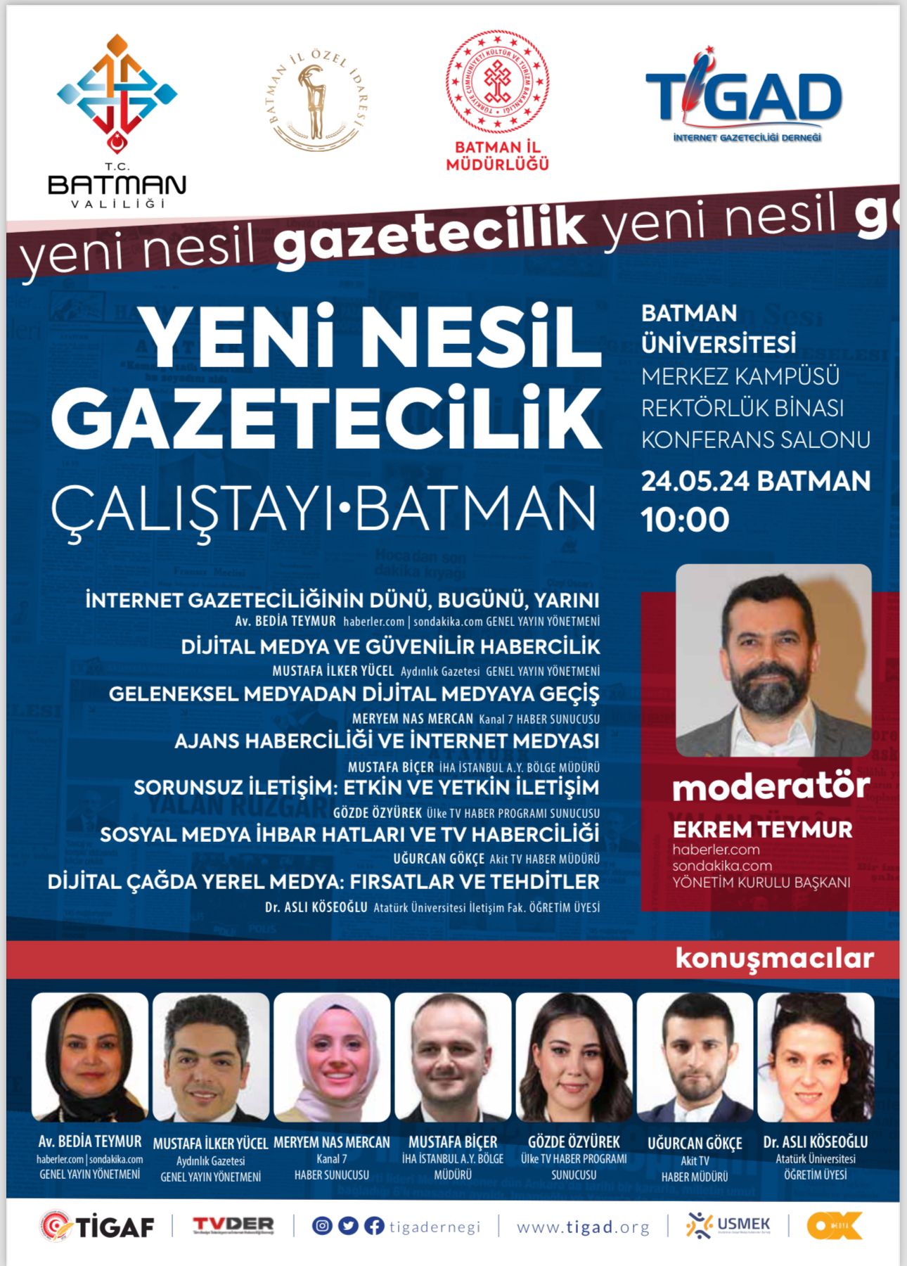 Batman Valiliği, Türkiye’nin en güçlü internet haber sitelerinin sahipleri ve CEO’larını Batman’da bir araya getiriyor. Türkiye İnternet Gazeteciler Derneği (TİGAD)’ne bağlı 81 ilden gazete sahiplerinin de katılacağı programa haberler.com ve sondakika.com Genel Yayın Yönetmeni Av. Bedia Teymur, Aydınlık Gazetesi Genel Yayın Yönetmeni Mustafa İlker Yücel, Kanal 7 Haber Sunucusu Meryem Nas Mercan, İHA İstanbul Bölge Müdürü Mustafa Biçer, Ülke Tv Haber Sunucusu Gözde Özyürek, Akit Tv Haber Müdürü Uğurcan Gökçe ve Atatürk Üniversitesi İletişim Fakültesi Öğr. Üyesi Dr. Aslı Köseoğlu, konuşmacı olarak katılacak. 24 Mayıs cuma günü saat 10.00’da Batman Üniversitesi Merkez Kampüs Rektörlük Binasında gerçekleşecek olan Yeni Nesil Gazetecilik Konferansının moderatörlüğünü ise haberler.com ve sondakika.com haber sitelerinin Yönetim Kurulu Başkanı Ekrem Teymur yapacak.