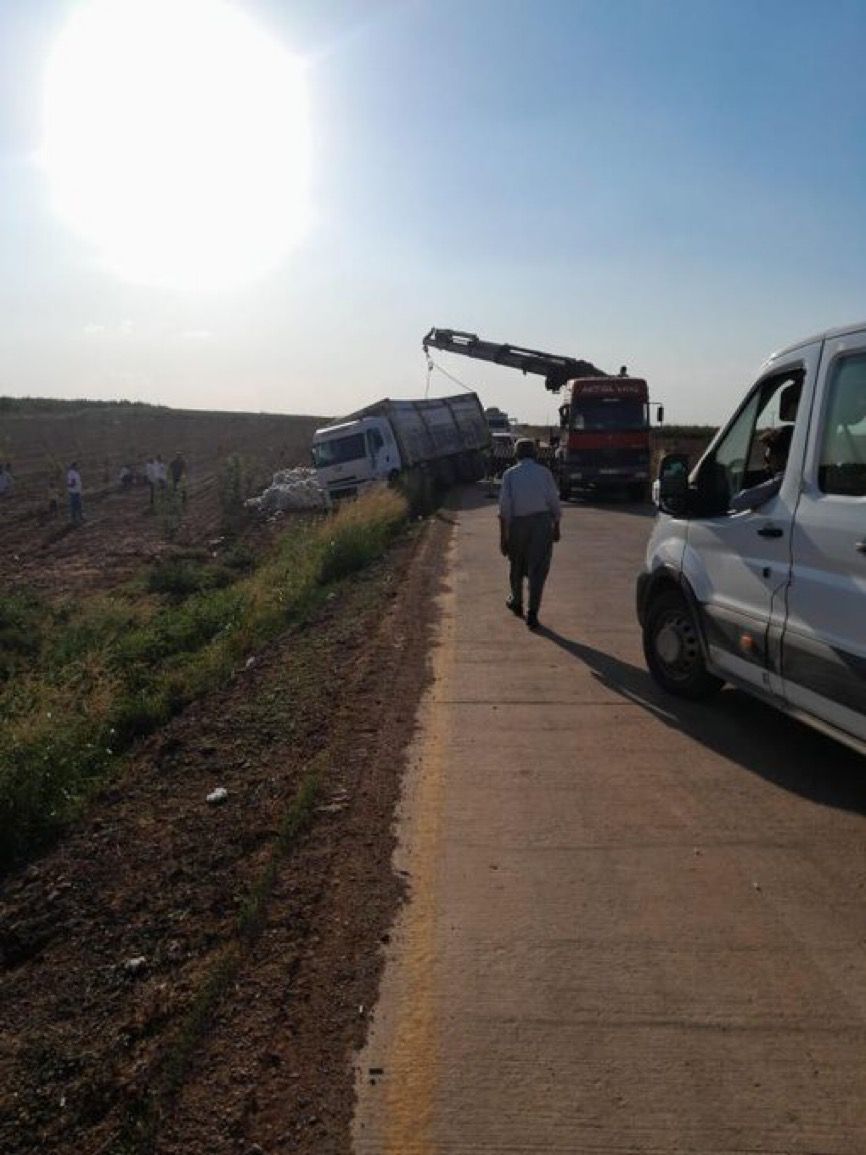 Kaza Şanlıurfa’nın Bozova ilçesine Dutluk kırsal mahallesi civarında meydana geldi. İddiaya göre henüz plakası öğrenilemeyen pamuk yüklü bir kamyon sürücüsünün kontrolünü kaybetmesi sonucu şarampole devrildi.