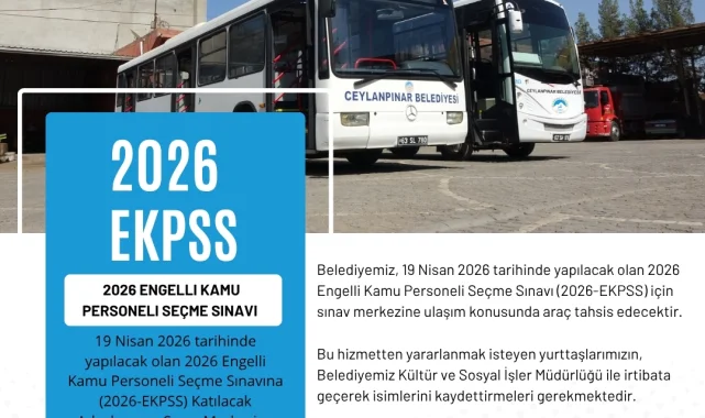 Ceylanpınar Belediyesi, 19 Nisan 2026 tarihinde düzenlenecek olan 2026 Engelli Kamu Personeli Seçme Sınavı (2026-EKPSS) öncesinde sınav merkezine ulaşım konusunda adaylara destek olacağını duyurdu.Belediye tarafından yapılan açıklamada, sınava girecek engelli vatandaşların sınav merkezlerine rahatça ulaşabilmeleri amacıyla araç tahsis edileceği belirtildi. Bu destek, adayların sınav günü herhangi bir ulaşım sorunu yaşamaması hedefleniyor.