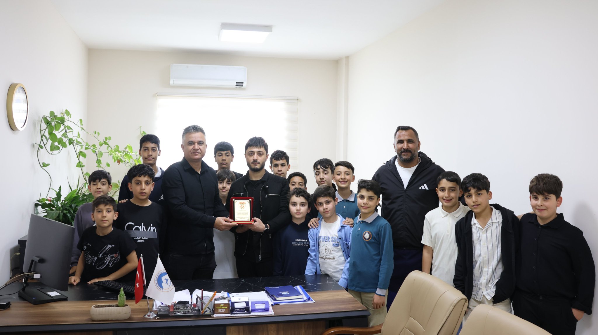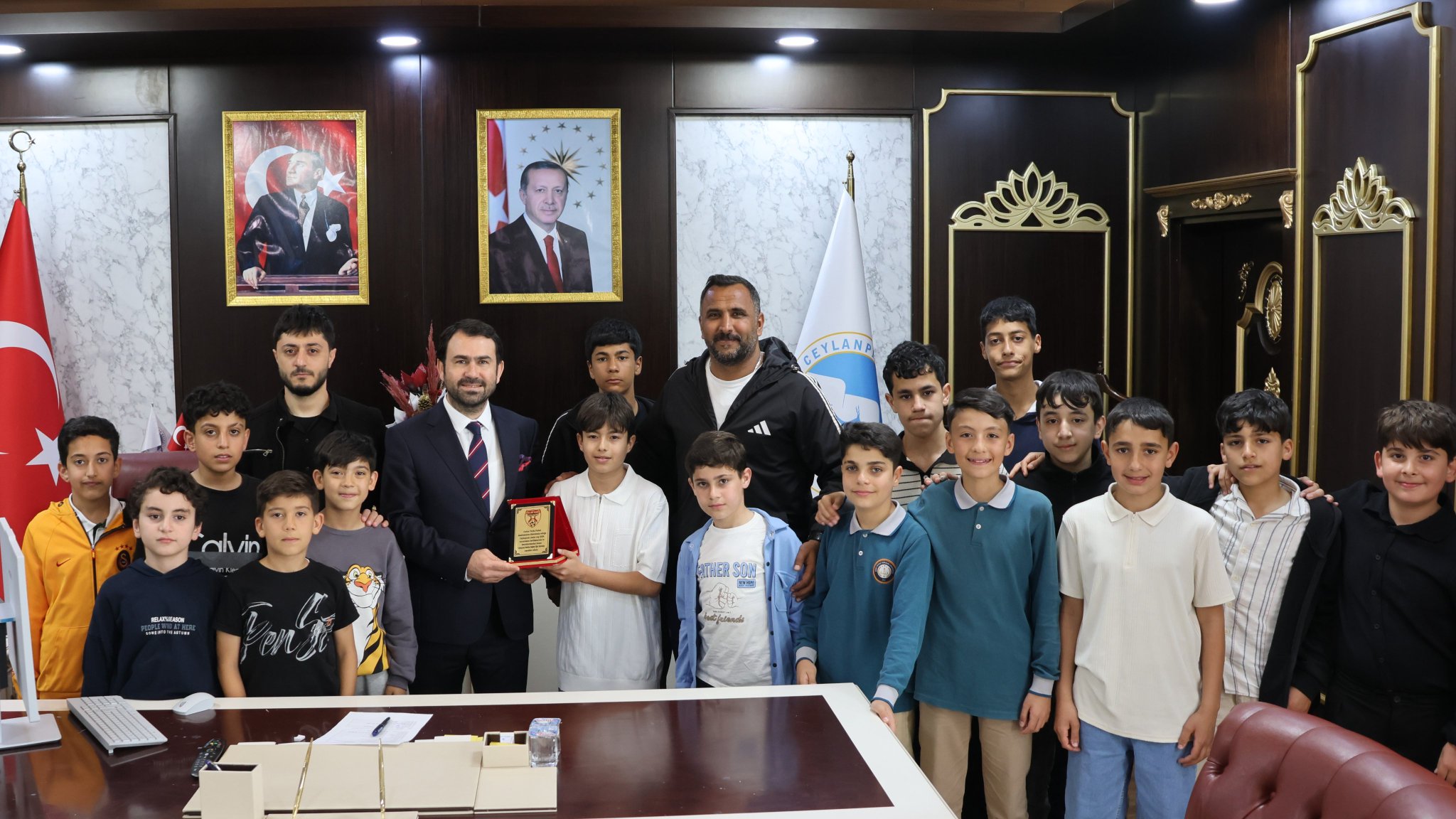 Ceylanpınar Junior Cup 2026 turnuvasının şampiyonu olan Ceylan Yurdu Futbol Akademisi minik takımı, Ceylanpınar Belediyesi'ne bir teşekkür ziyaretinde bulundu.Turnuvada elde ettikleri başarıyla kupayı kaldıran genç sporcular, belediye yetkililerine desteklerinden dolayı minnettarlıklarını iletti. Ziyaret, Ceylanpınar'da sporun ve gençlerin gelişimine verilen önemi bir kez daha gözler önüne serdi.