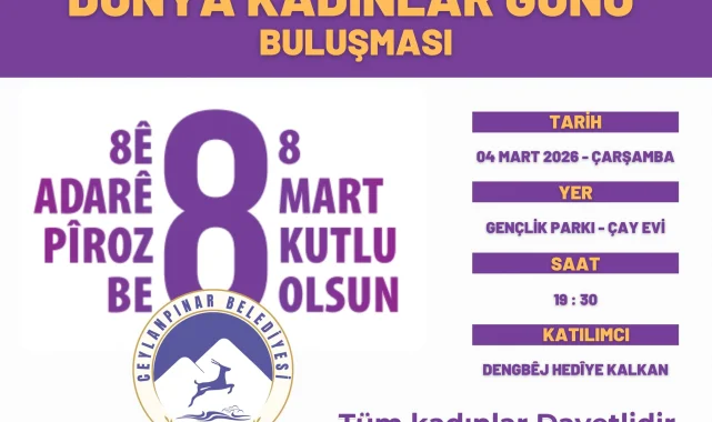 Ceylanpınar Belediyesi Kadın ve Aile Hizmetleri Müdürlüğü tarafından organize edilen 8 Mart Dünya Kadınlar Günü etkinliği bugün saat 19:30'da Gençlik Parkı Çay Evi'nde gerçekleştirilecek. Etkinlik kapsamında kadınlar bir araya gelerek günlerini kutlayacak.Bugün, 4 Mart 2026 Çarşamba günü Ceylanpınar'da kadınlar için özel bir buluşma gerçekleşecek. Gençlik Parkı'nda saat 19:30'da başlayacak olan etkinlik, Ceylanpınar Belediyesi Kadın ve Aile Hizmetleri Müdürlüğü tarafından düzenleniyor. Bu özel günde kadınlar, dayanışma ve kutlama amacıyla bir araya gelecek.
