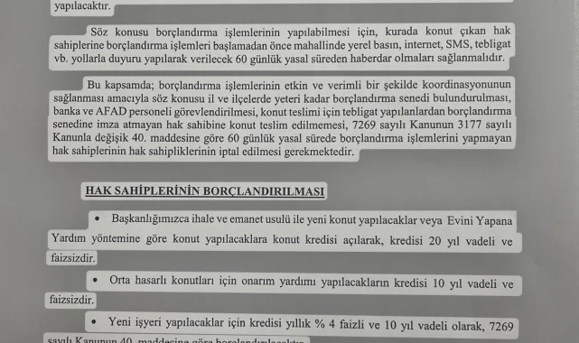 06.02.2023 tarihli deprem afetlerinden etkilenen il merkezleri ve ilçelerinde 7269 sayılı Kanun kapsamında hak sahibi olan vatandaşlar için önemli bir bilgilendirme yapıldı.16.10.2025, 14.11.2025 ve 27.12.2025 tarihlerinde noter kurası ile konut çıkan hak sahiplerinin açık borçlandırma işlemleri hakkında detaylar duyuruldu.