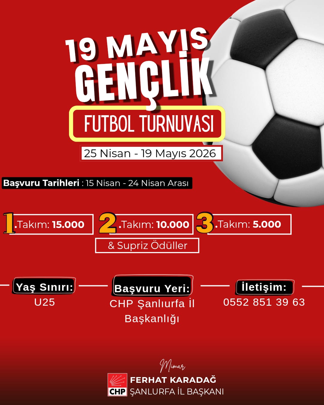 Karadağ, U25 yaş grubundaki tüm gençleri turnuvaya katılmaya davet ederek, başvuruların CHP Şanlıurfa İl Başkanlığı üzerinden yapılabileceğini belirtti.