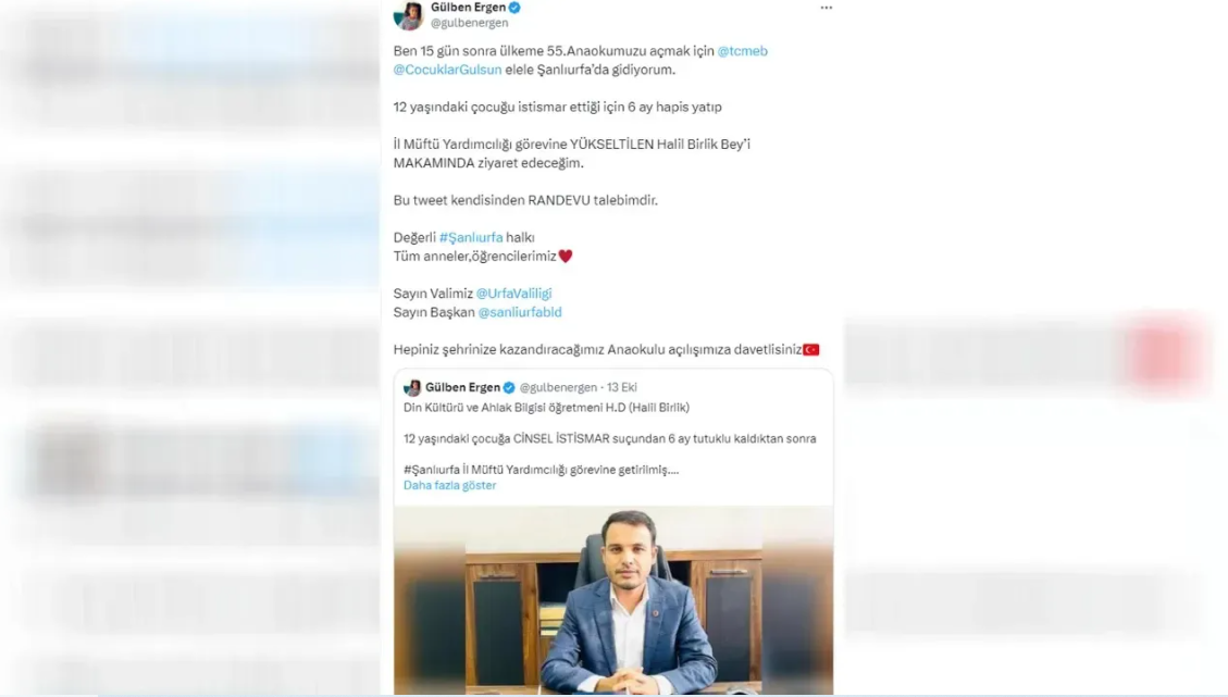 Şanlıurfa’nın Akçakale ilçesinde müftülük yaptığı dönemde, 12 yaşındaki bir kız çocuğuna cinsel istismarda bulunduğu iddiasıyla hakkında dava açılan ve daha sonra 6 ay hapis yatan H.B.’nin Şanlıurfa İl Müftü Yardımcısı olarak atanmasına yönelik tepkiler gelmeye devam ediyor.Adli kontrol şartıyla serbest bırakılan ve Kasım ayında yeniden hakim karşısına çıkacak olan H.B.’nin bu göreve getirilmesi yönündeki eleştiriler dile getiriliyor.H.B.’nin yeni görevine ilişkin tepkiler gelmeye devam ederken, çocukların eğitim ve haklarıyla ilgili önemli projelere imza atan Sanatçı Gülben Ergen de sosyal medya hesabından tepki gösterdi.Tartışmaların odağındaki ismi ziyaret etmek için 15 gün sonra Şanlıurfa’ya geleceğini kaydeden Ergen, yaptığı paylaşımda şunları ifade etti:“Ben 15 gün sonra ülkeme 55. Anaokumuzu açmak için @tcmeb@CocuklarGulsun elele Şanlıurfa’da gidiyorum. 12 yaşındaki çocuğu istismar ettiği için 6 ay hapis yatıpİl Müftü Yardımcılığı görevine YÜKSELTİLEN Halil Birlik Bey’i MAKAMINDA ziyaret edeceğim.Bu tweet kendisinden RANDEVU talebimdir.Değerli #Şanlıurfa halkıTüm anneler, öğrencilerimizSayın Valimiz@UrfaValiligiSayın Başkan@sanliurfabldHepiniz şehrinize kazandıracağımız Anaokulu açılışımıza davetlisiniz” ifadelerini kullandı.