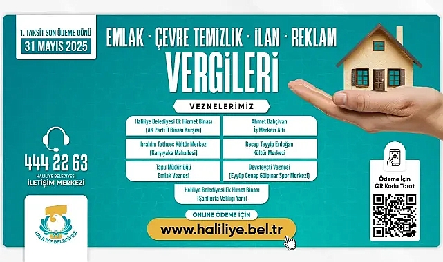 Haliliye Belediyesi, 2025 Yılı Emlak, İlan- Reklam ve Çevre Temizlik Vergisi 1. Taksit ödemelerinde son günün 31 Mayıs olduğunu ve ödemelerin internetten kolaylıkla yapılabileceğini duyurdu.
