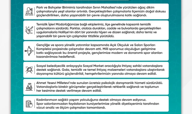 Haliliye Belediyesi, 17 Nisan 2026 tarihine ait ilçe gündemini değerlendirdi. Belediye, ilçenin gelişimi için çalışan tüm ekip arkadaşlarına teşekkürlerini iletti.Yapılan açıklamada, Haliliye'nin daha iyi bir geleceğe taşınması için gösterilen çabaların vurgulandığı belirtildi. Ekip ruhunun önemine dikkat çekilerek, gösterilen özverili çalışmaların takdir edildiği ifade edildi.