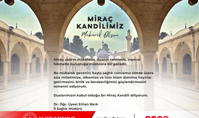 Harran Devlet Hastanesi, önemli dini günlerden biri olan Miraç Kandili dolayısıyla bir kutlama mesajı yayımladı.İl Sağlık Müdürü Dr. Öğr. Üyesi Erhan Berk tarafından paylaşılan mesajda, Miraç gecesinin manevi önemi vurgulandı.Dr. Öğr. Üyesi Erhan Berk, mesajında şu ifadelere yer verdi:"Miraç; sabrın mükâfatla, duanın rahmetle, inancın hikmetle buluştuğu müstesna bir gecedir. Miraç Kandilimiz Mübarek Olsun."Hastane yönetimi ve personeli adına yayımlanan bu kutlama mesajı, bölge halkının kandilini tebrik etme amacı taşıyor.Kaynak: Haber Merkezi