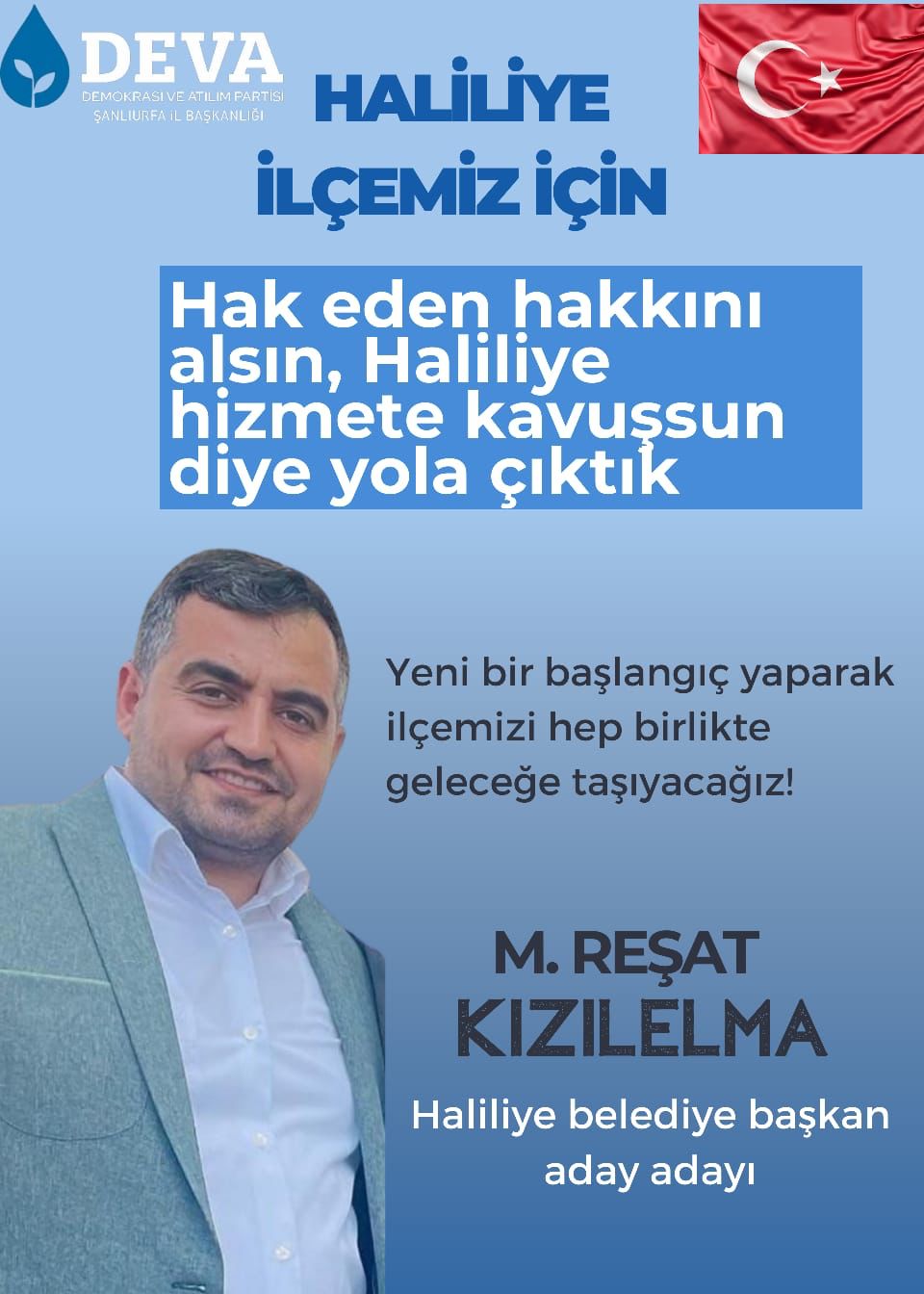 Bundan dolayı 31 Mart 2024 tarihinde yapılacak olan yerel seçimlerde DEVA Partisinden Haliliye Belediye Başkan Aday Adaylığı için resmi müracaatımızı yaparak bu yola çıkmış bulunuyoruz.