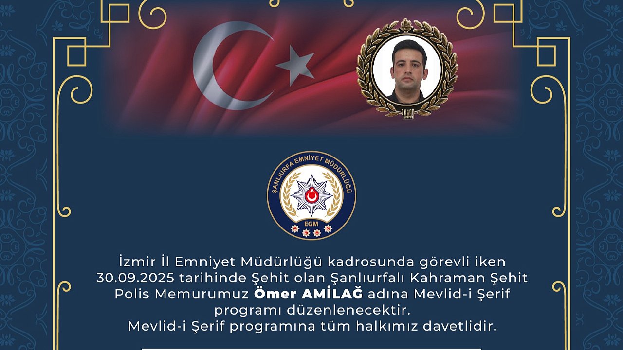 ŞANLIURFA – İzmir İl Emniyet Müdürlüğü kadrosunda görev yaparken 30 Eylül 2025 tarihinde şehit olan Şanlıurfalı Polis Memuru Ömer Amilağ için memleketi Şanlıurfa’da Mevlid-i Şerif programı düzenlenecek.