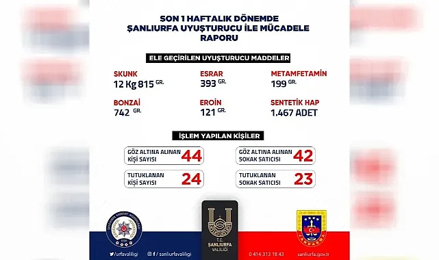 Şanlıurfa Valisi Hasan Şıldak, kentte son haftada Şanlıurfa İl Emniyet Müdürlüğü ve Şanlıurfa İl Jandarma Komutanlığı’nın uyuşturucuyla mücadeleye ilişkin raporunu paylaştı.Söz konusu rapora göre; Şanlıurfa’da son bir haftada 12 kg 815 gram skunk, 393 gram esrar, 199 gram metamfetamin, 742 gram bonzai, 121 gram eroin, 1.467 adet sentetik hap ele geçirildi.Yine raporda; 44 kişi gözaltına alınırken 24 kişi tutuklandı. Son bir haftada 42 sokak satıcısı gözaltına alınırken, 23 sokak satıcısı ise tutuklandı.