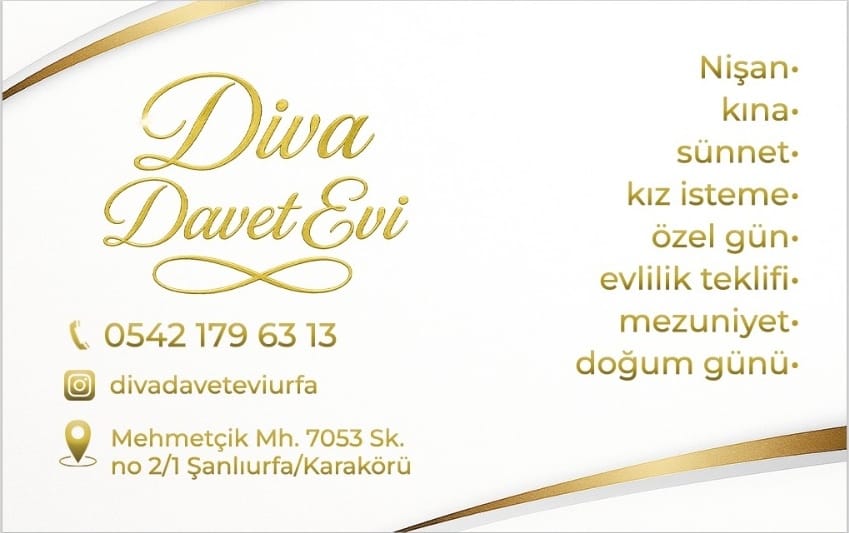 Açılışı gerçekleştirilen Diva Davet Evi’nin işletmeciliğini iş insanı Mustafa Yaşar üstleniyor. Modern yapısı, geniş kapasitesi ve şık mimarisiyle dikkat çeken mekan, düğün, nişan, kına, mezuniyet töreni, sünnet gibi birçok organizasyona ev sahipliği yapacak şekilde tasarlandı. Şanlıurfa’nın sosyal hayatına yeni bir soluk getirmeyi amaçlayan işletme, hem mimari yapısı hem de sunduğu hizmet kalitesiyle şehirdeki benzer mekanlardan ayrılıyor.