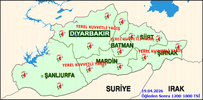 Bugün, 19 Nisan Pazar günü Şanlıurfa merkezde gök gürültülü sağanak yağış bekleniyor. Meteoroloji Genel Müdürlüğü'nün (MGM) verilerine göre, en düşük sıcaklık 12°C, en yüksek sıcaklık ise 19°C civarında seyredecek. Bölge genelinde etkili olması beklenen sağanak ve gök gürültülü sağanak yağışların Şanlıurfa'nın bazı çevrelerinde kuvvetli (21-50 kg/m2) olacağı tahmin ediliyor. Ayrıca, hava kalitesini etkileyebilecek toz taşınımı da öngörülüyor.Yetkililer, ani sel, su baskını, yıldırım düşmesi, yerel dolu yağışı, ulaşımda yaşanabilecek aksamalar, yağış anında kuvvetli rüzgar ve toz taşınımıyla birlikte çamur şeklinde yağış gibi olumsuzluklara karşı vatandaşların dikkatli ve tedbirli olmaları konusunda uyarıda bulundu. Hava sıcaklığında önemli bir değişiklik beklenmezken, rüzgarın güney ve doğu yönlerden hafif ve orta kuvvette esmesi, yağış anında ise kuvvetlenmesi öngörülüyor.