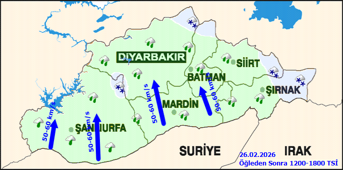 MGM, bölge genelinde çığ tehlikesi ve kuvvetli rüzgar uyarısında bulundu. 26 Şubat Perşembe günü güney yönlerden esecek rüzgarın yer yer fırtına şeklinde (50-70 km/s, yer yer 80 km/s) etkili olması bekleniyor. Ayrıca, yüksek kar örtüsüne sahip eğimli bölgelerde çığ tehlikesine karşı dikkatli olunması gerektiği belirtildi.Yağış Tahminleri ve İlçe Bazlı Durum