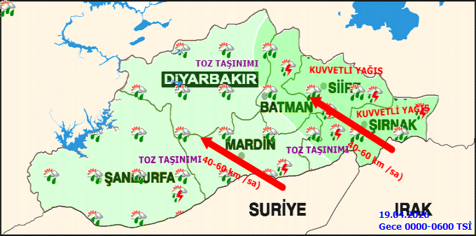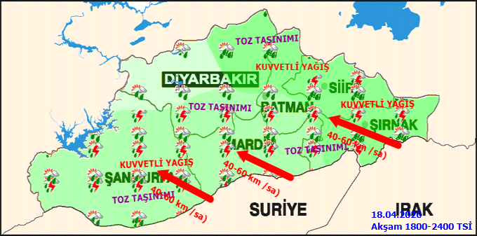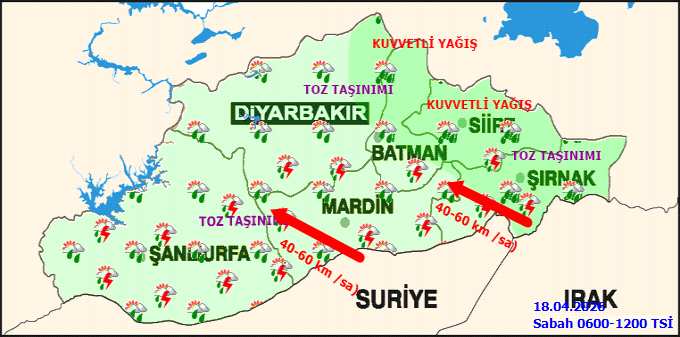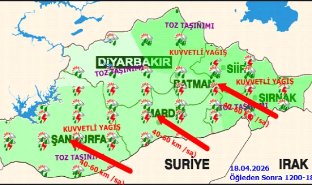 Şanlıurfa ve ilçelerinde 18 Nisan 2026 Cumartesi günü kuvvetli gök gürültülü sağanak yağış bekleniyor. Meteoroloji Genel Müdürlüğü (MGM) tarafından yapılan açıklamaya göre, bölgede ani sel, su baskını, yıldırım, yerel dolu ve ulaşımda aksamalar gibi olumsuzluklara karşı dikkatli olunması uyarısı yapıldı.Şanlıurfa merkezde sıcaklıkların 14 ila 18 derece arasında seyretmesi öngörülürken, ilçelerdeki beklenen sıcaklıklar da duyuruldu. Akçakale 15-21°C, Birecik 13-19°C, Bozova 12-17°C, Ceylanpınar 14-21°C, Eyyübiye 14-18°C, Halfeti 14-17°C ve Haliliye 14-18°C olarak tahmin ediliyor.