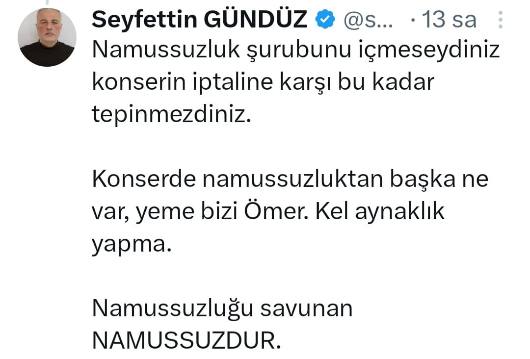 Seyfettin Gündüz'ün bu paylaşımıyla konserlerin iptal edilmesini eleştiren yüz binlerce insana hakaret ettiği, Kültür ve Turizm Bakanlığı'nın yaptığı organizasyonun ağır bir dille ve hakaretle eleştirdiği anlaşılıyor.