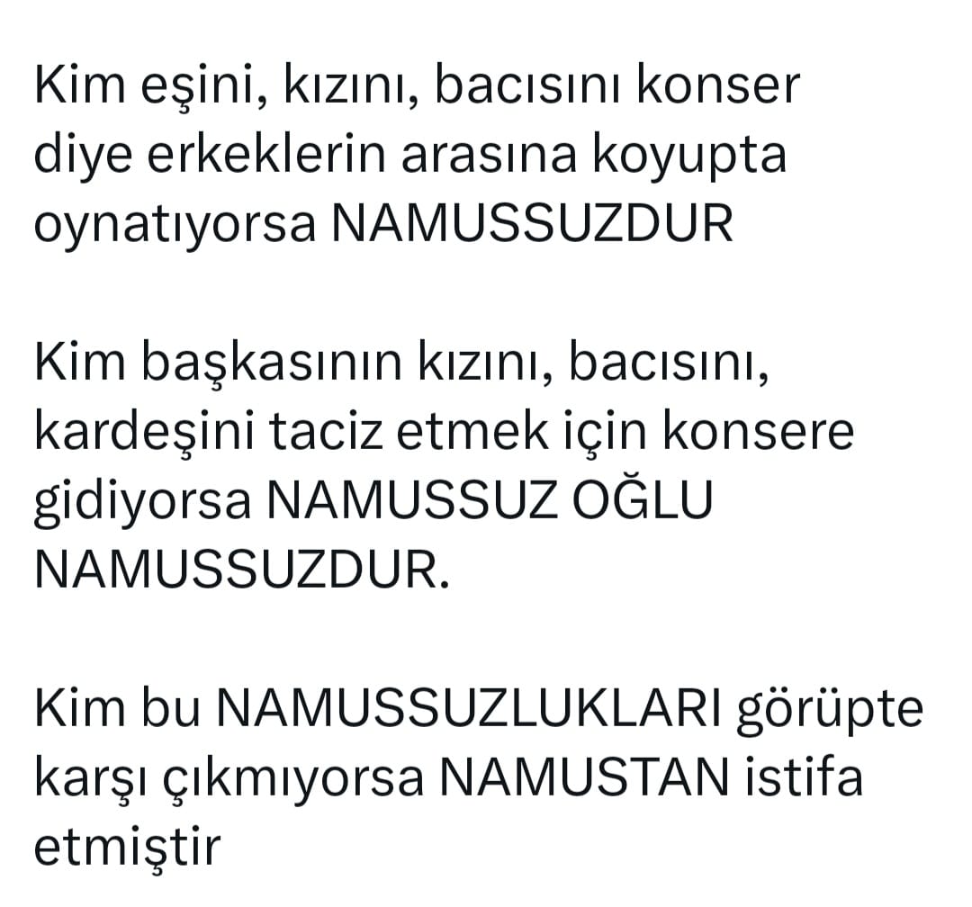 Seyfettin Gündüz isimli şahıs sosyal medya hesabından "Kim eşini, kızını, bacısını konser diye erkeklerin arasına koyupta oynatıyorsa namussuzdur" dedi.Kamuoyunda ciddi tepkilerin oluşması sonucunda paylaşımını kaldıran şahıs herhangi bir özür dilemedi.