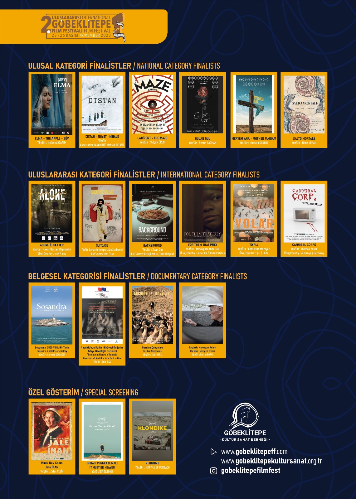 Karaköprü Belediyesinin ana sponspor olduğu Uluslararası Göbeklitepe Film Festivalinde Finale kalan ulusal ve uluslararası 12 kısa filmin dışında. Cannes, Berlinale, Sundance gibi önemli festivallere katılan TRT ortak yapımı olan Ukrayna’nın Oscar adayı Klondike filmi ve Filistin yapımı Burası Cennet Olmalı filmlerinin özel gösterimleri festival kapsamında yapılacak. Söyleşi ve müzik dinletilerinin de yer alacağı festival bu yıl çok ses getirecek gibi görünüyor.