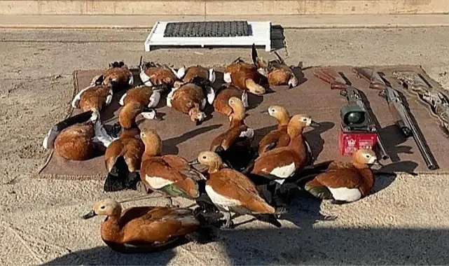 Şanlıurfa’da kaçak avcılıkla mücadele çalışmaları sürüyor.Bu kapsamda harekete geçen jandarma ekipleri, kaçak avlanan şahıslara baskın yaptı.Siverek ilçesine bağlı Beyçeri Mahallesinde yapılan çalışmada, 9 adet canlı, 9 adet de ölü olmak üzere toplam 18 adet angut kuşu ele geçirildi.Kaçak avlandığı tespit edilen 3 şahsa cezalar kesildi. Her şahsa 15 bin 959 TL ceza kesilirken, konuyla ilgili açıklamada şu ifadelere yer verildi:“Siverek İlçesi Jandarma Komutanlığınca, Beyçeri Mahallesi Saadettin Sokakta 08.01. 2023 günü saat: 12:20 sıralarında kaçak kara avcılığı ihbarının alınması üzerine yapılan önleyici kolluk devriyesi esnasında B.G., F.Y., S.T. isimli şahısların arazide; ruhsatlı, takozsuz av tüfekleri ile 9 adet canlı, 9 adet cansız olmak üzere toplam 18 adet Angut Kuşunu usulsüz olarak avlarlarken yakalanmışlardır.