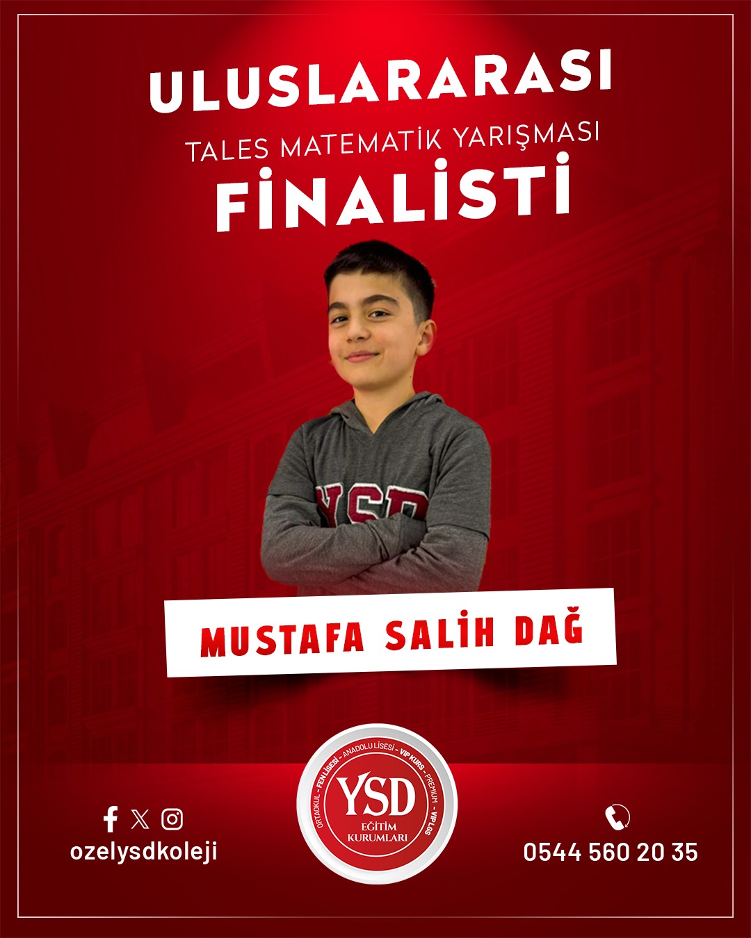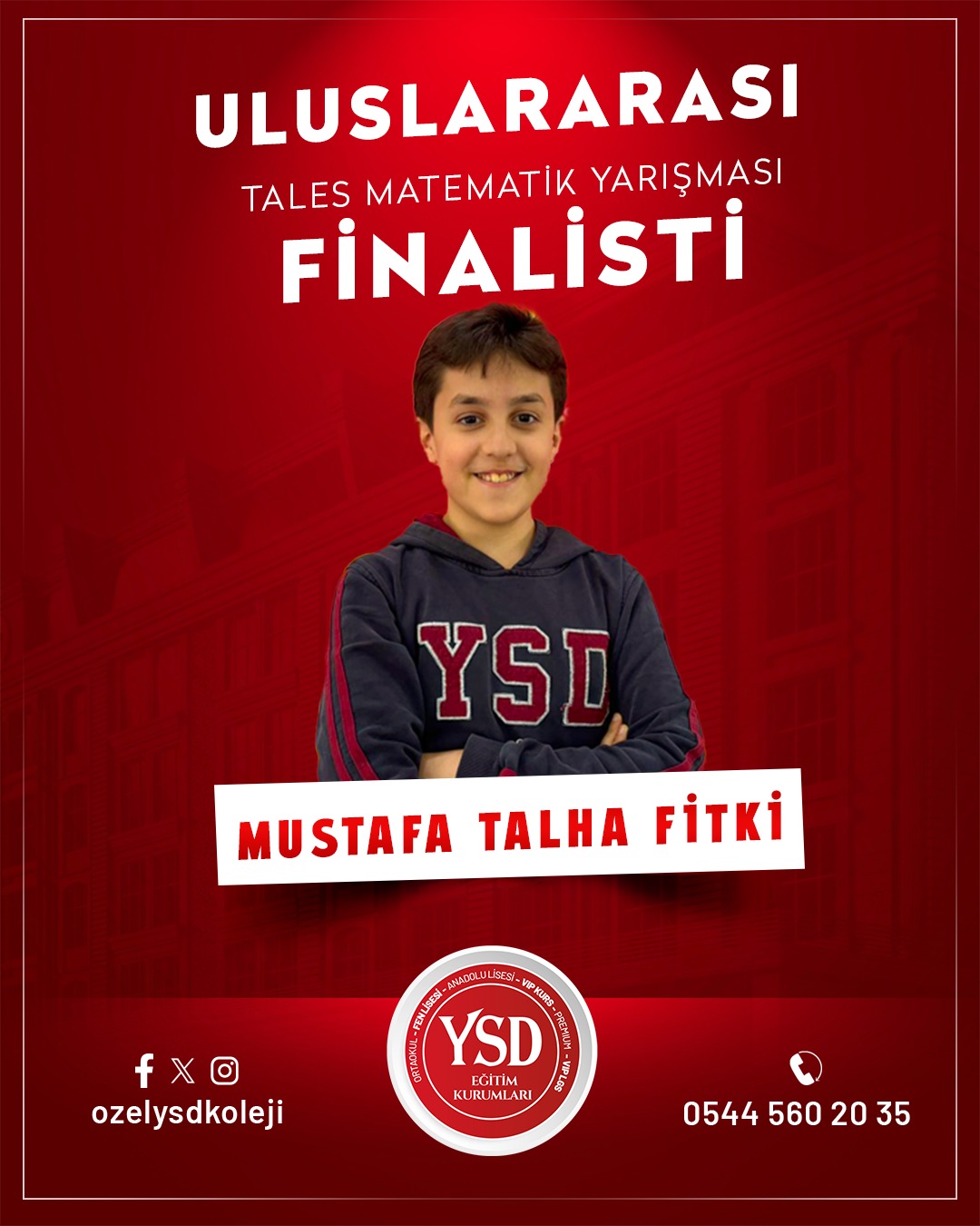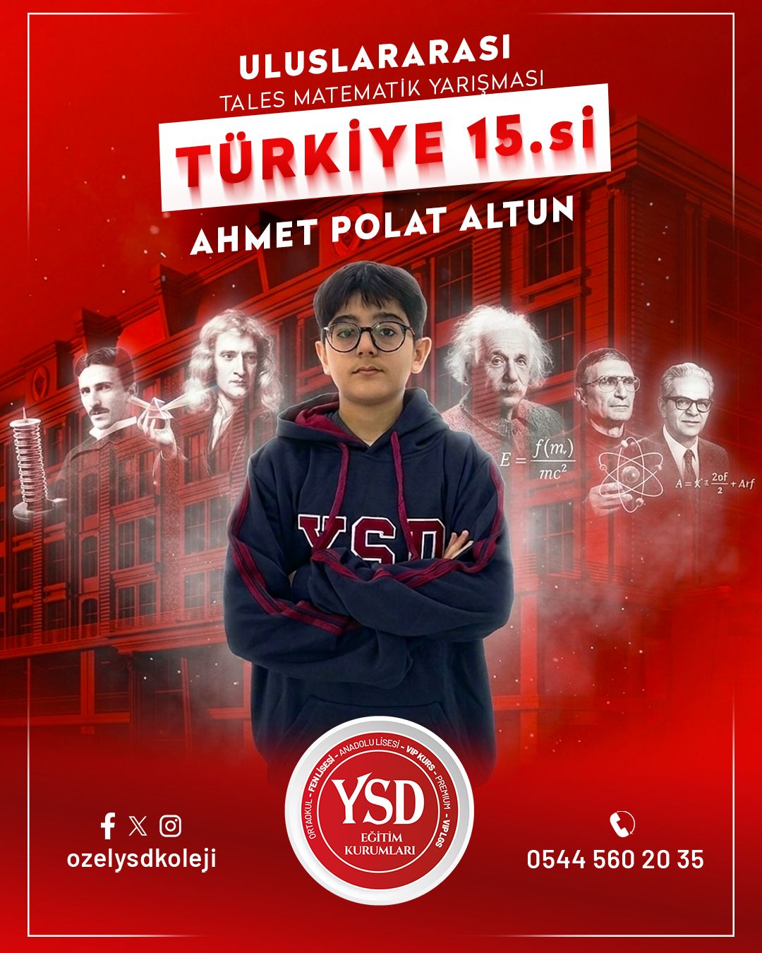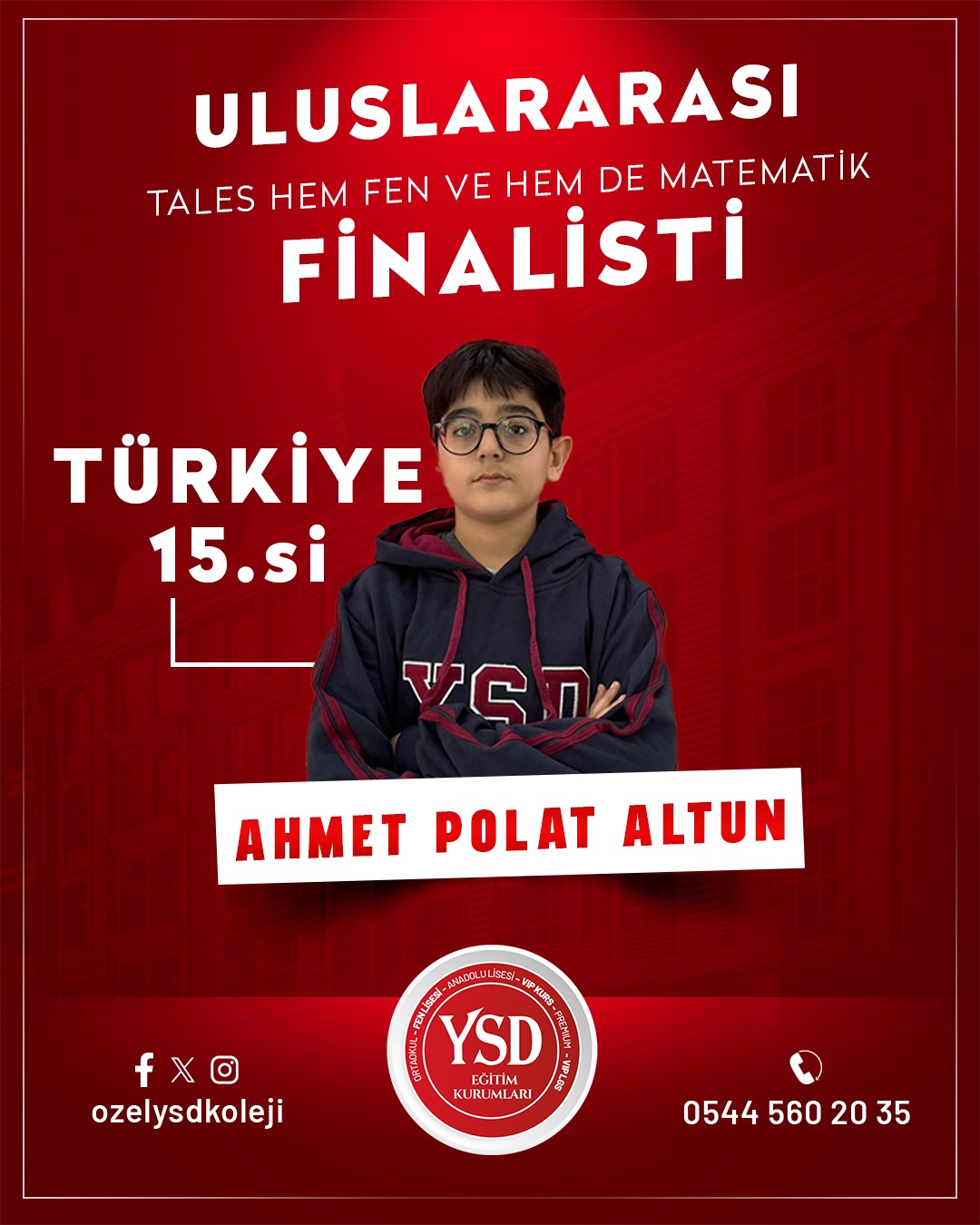 Geçtiğimiz hafta Türkiye Dart Şampiyonası’nda Türkiye 3.’lüğünü elde eden YSD Koleji öğrencisi Süleymancan Durmuş’un başarısının ardından, bu kez akademik alanda önemli bir başarı haberi geldi. Tales Matematik Yarışmaları’nda YSD Koleji öğrencisi Ahmet Polat Altun, Türkiye 15.’si olarak büyük bir başarıya imza attı ve finalist olmaya hak kazandı.Bununla birlikte YSD Koleji’nin birçok öğrencisi de aynı yarışmada gösterdikleri üstün performansla finale kalarak okulun akademik başarısını bir kez daha gözler önüne serdi.