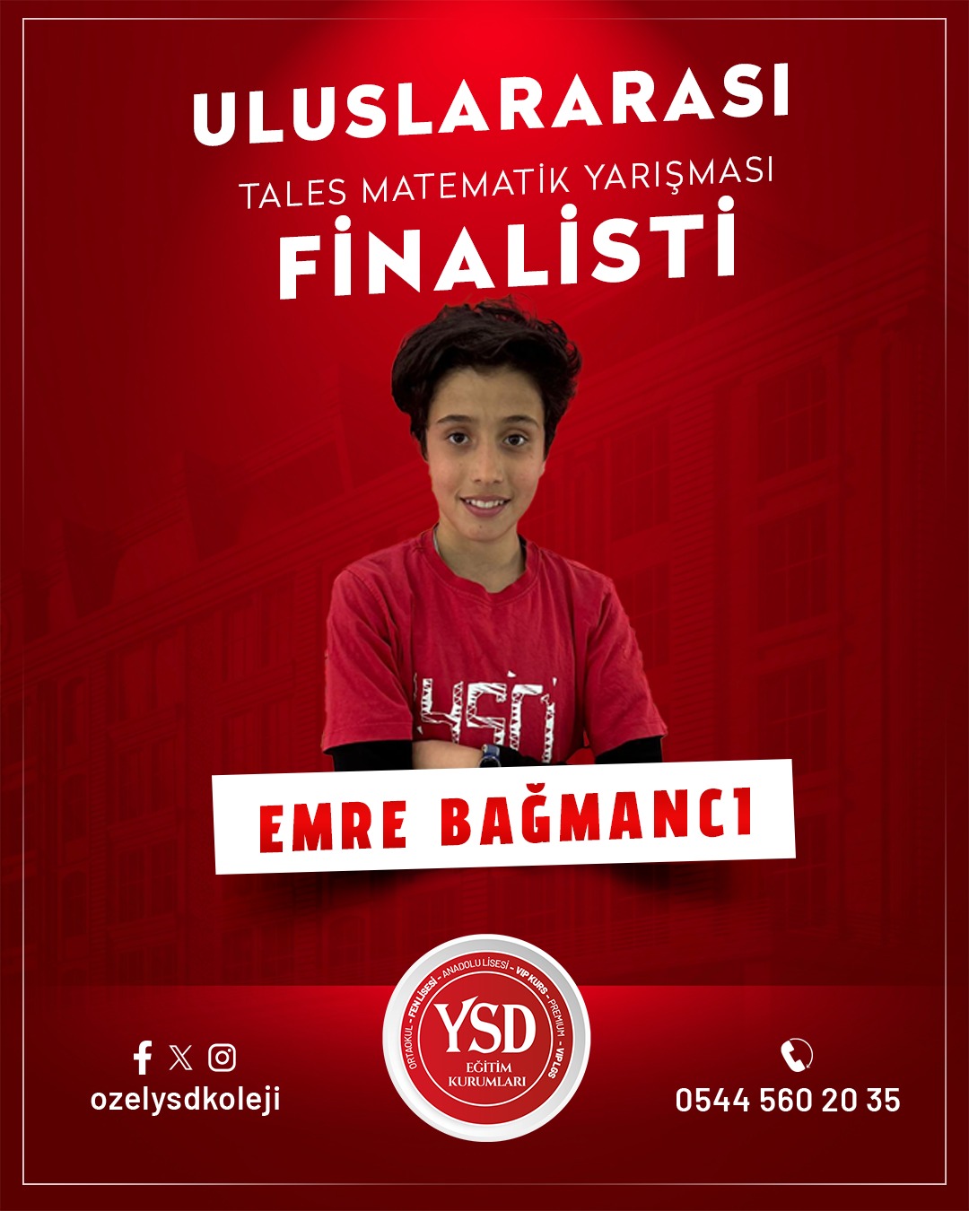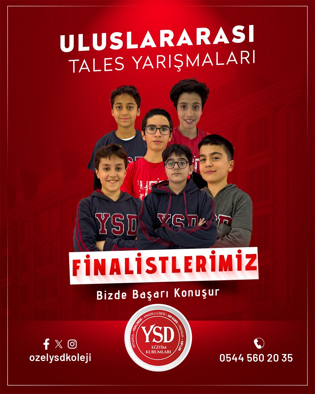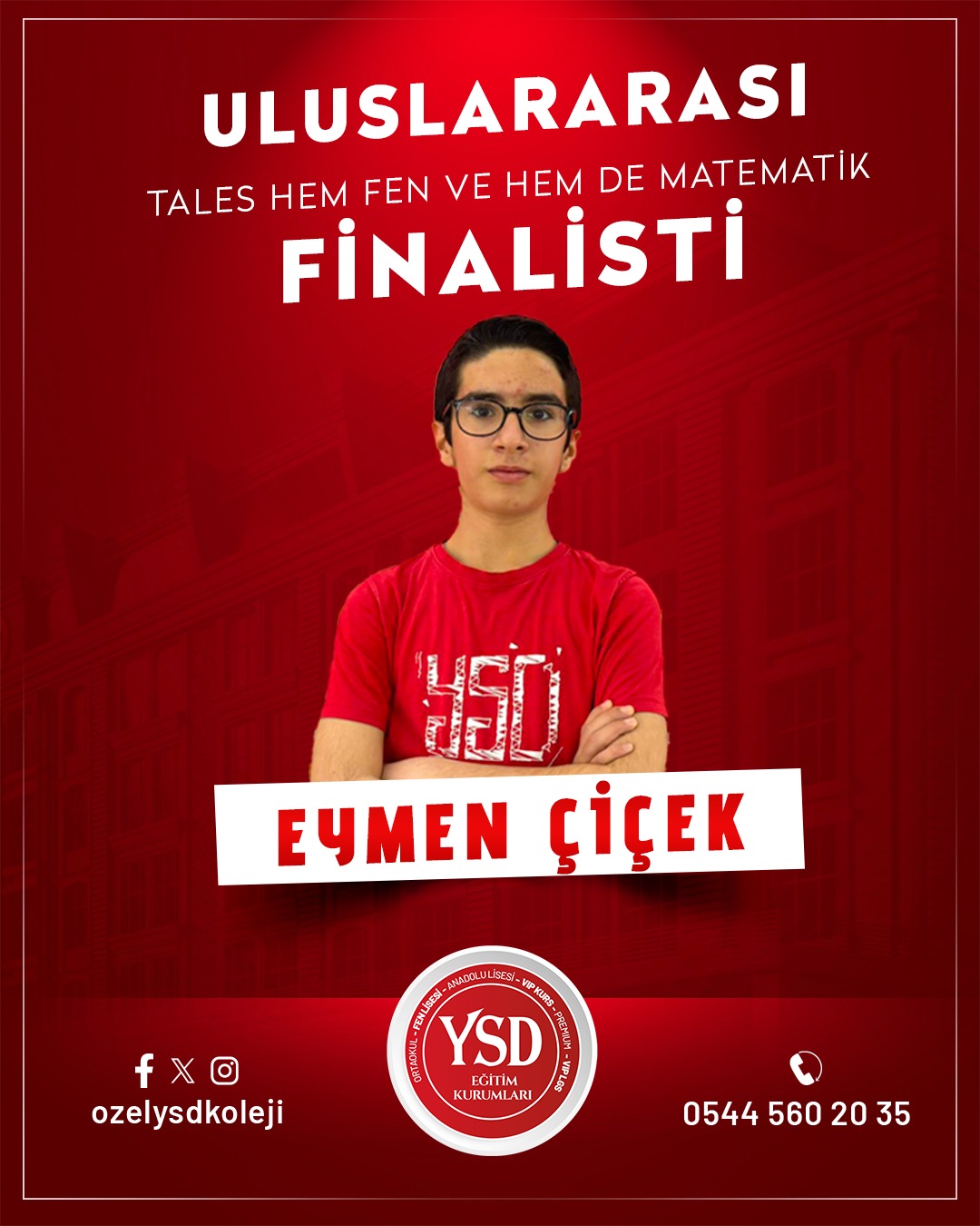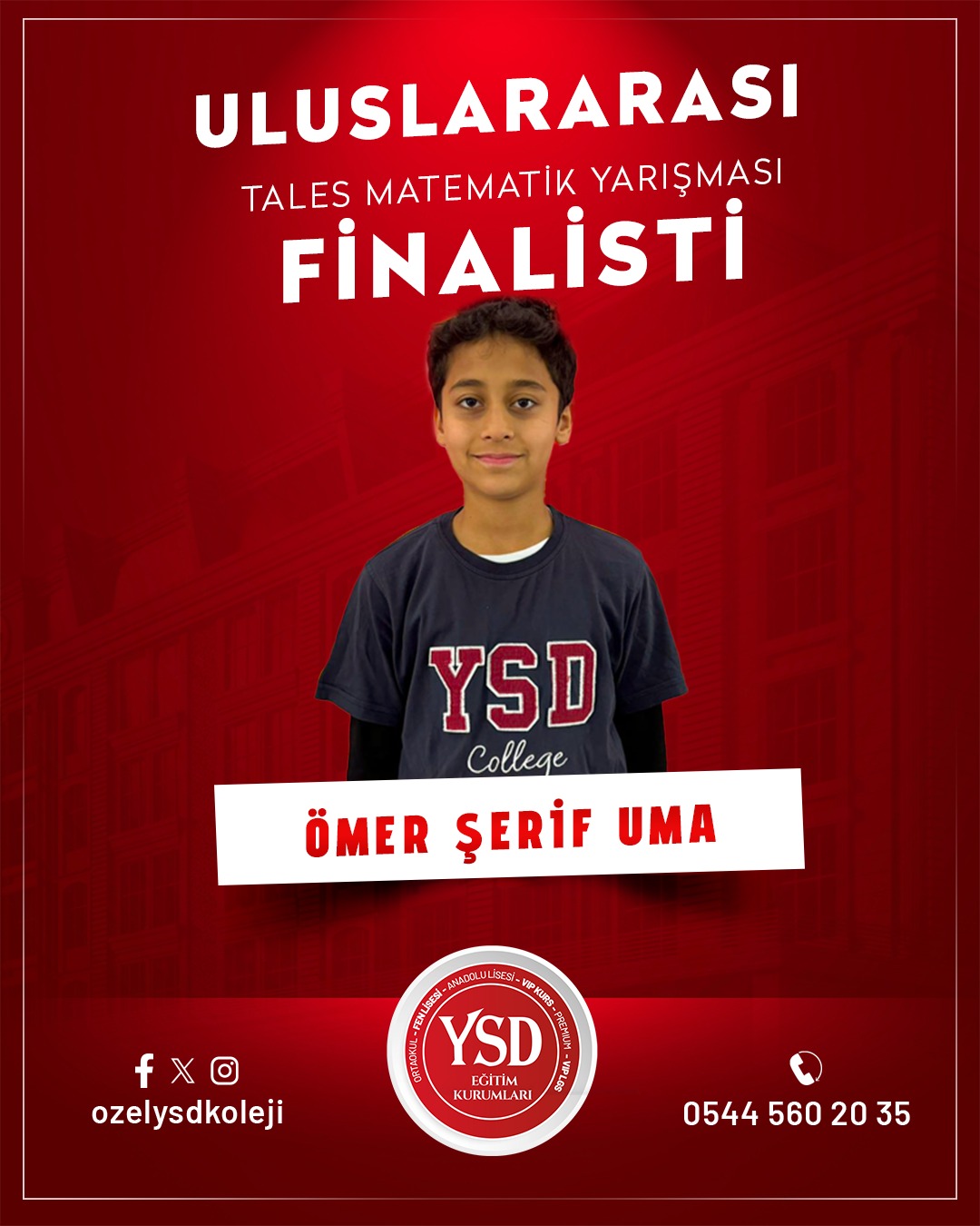 Geçtiğimiz hafta Türkiye Dart Şampiyonası’nda Türkiye 3.’lüğünü elde eden YSD Koleji öğrencisi Süleymancan Durmuş’un başarısının ardından, bu kez akademik alanda önemli bir başarı haberi geldi. Tales Matematik Yarışmaları’nda YSD Koleji öğrencisi Ahmet Polat Altun, Türkiye 15.’si olarak büyük bir başarıya imza attı ve finalist olmaya hak kazandı.Bununla birlikte YSD Koleji’nin birçok öğrencisi de aynı yarışmada gösterdikleri üstün performansla finale kalarak okulun akademik başarısını bir kez daha gözler önüne serdi.